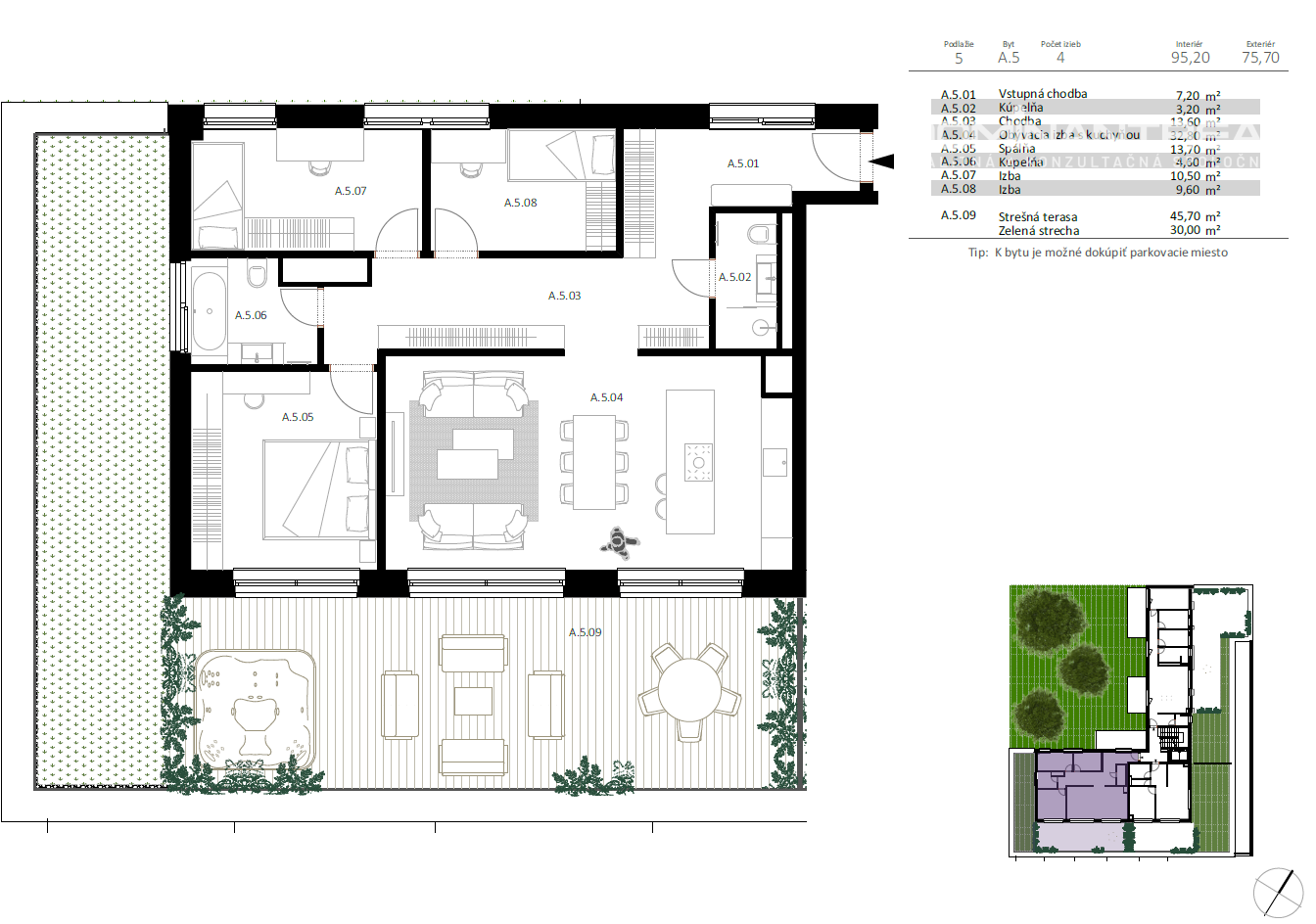 Tento byt predstavuje ideálne spojenie moderného dizajnu, kvalitného štandardu a pokojného bývania, pričom orientácia do tichej obytnej časti zabezpečuje príjemnú atmosféru a dostatok súkromia.